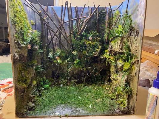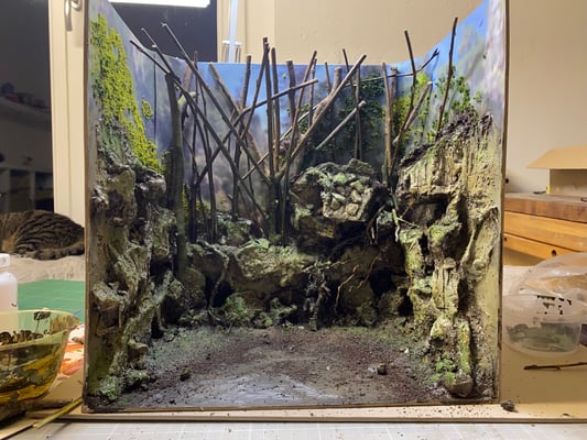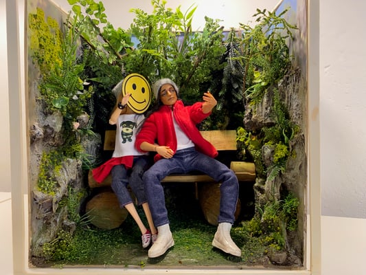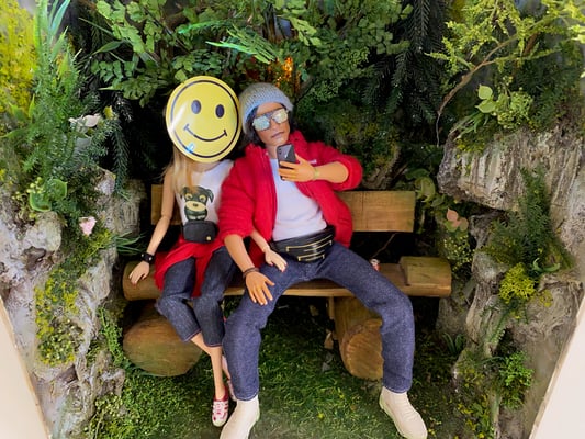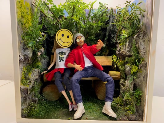 Dieses Diorama ist einem Profilbild nachempfunden, auf dem eine weibliche Person (wahrscheinlich die Expartnerin) durch ein auf das Gesicht geklebtes Emoticon unkenntlich gemacht wurde.