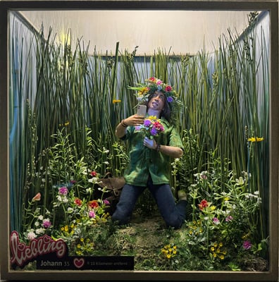 In Schaukästen (33 × 33 × 23 cm) wird die bizarre Welt digitaler Selbstinszenierung sichtbar: Jede Box rekonstruiert ein Kontakt-Selfie aus Singlebörsen – detailgetreu nachgebaut mit Puppen, deren Gesichter, Körper und Kleidung verändert und verfremdet wurden. Die Figuren fotografieren sich mit Handy, Tablet oder Laptop für „Liebling Singles24.de“, eine fiktive Partnerbörse. Ihre Kommunikation bleibt ausschließlich digital. Die Schaukästen zeigen, wie sehr Bilder heute unsere Kommunikation prägen. Wir inszenieren uns, optimieren uns mit Filtern oder KI, verhüllen uns oder rutschen ins Groteske – immer auf der Suche nach Sichtbarkeit auf Tinder, Instagram, TikTok & Co.