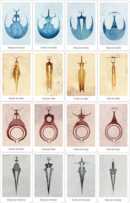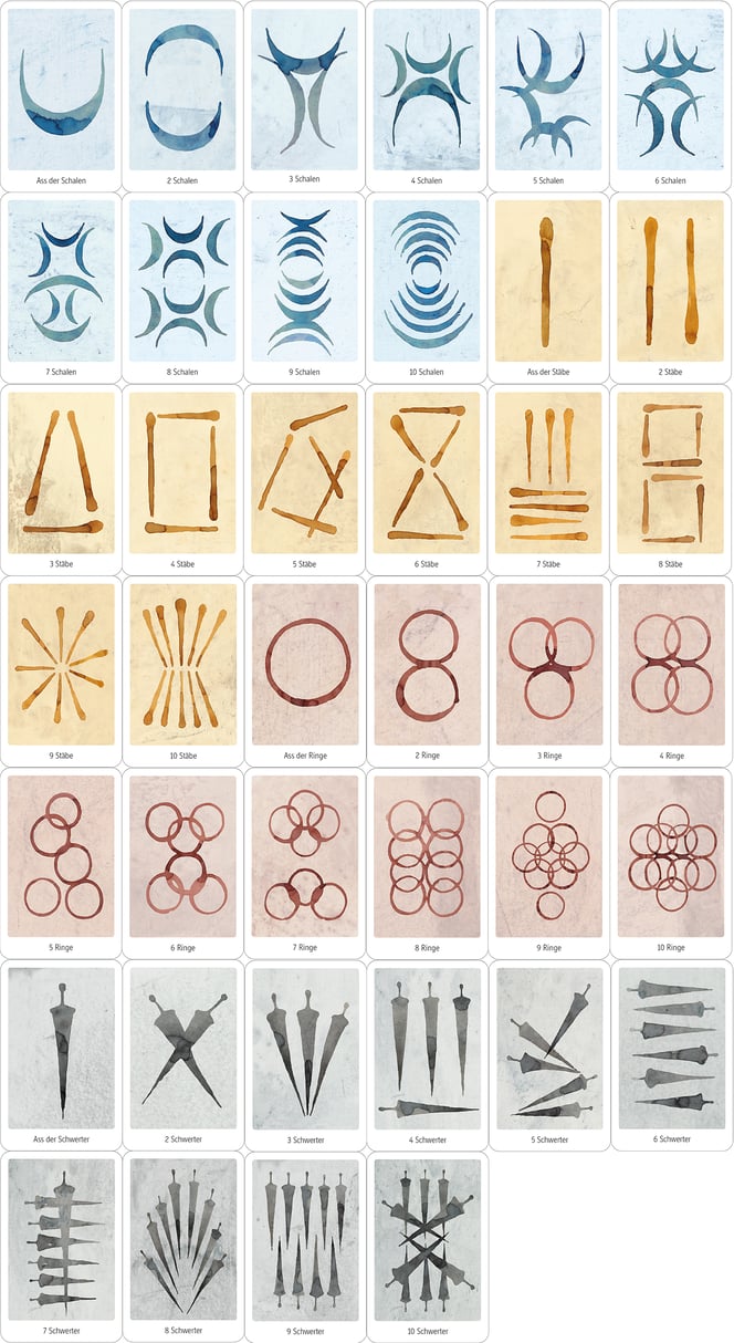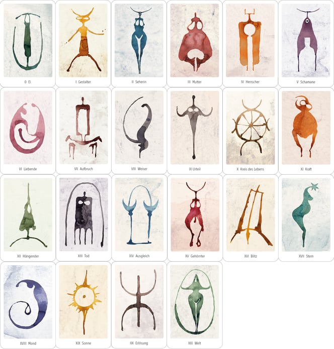 Dieses Tarotdeck umfasst 78 Karten – die 22 Karten der Großen Arkana sowie die 56 Karten der Kleinen Arkana. Die Gestaltung folgt einer bewusst minimalistischen Bildsprache - die jahrtausendealten archetypischen Bedeutungen des Tarots sind in einfache, abstrakte Zeichen übersetzt, deren Formensprache sich unter anderem an frühzeitlichen Zeichen, wie Höhlenmalereien oder Felsgravuren orientiert. Auf eine narrative Bildwelt wird bewußt verzichtet.