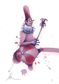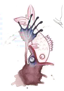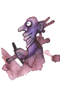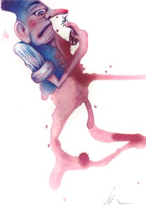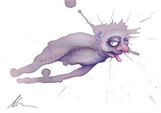 Das kennt doch bestimmt jeder: Manchmal schaut man sich ein Muster an, eine Struktur oder eine Wolkenformation und kommt aus dem Staunen nicht mehr heraus, weil darin etwas zu entdecken und zu erahnen ist. Diese spielerische Auseinandersetzung mit dem Zufall ist spannend und entspannt zugleich, sie regt die Phantasie an. In ähnlicher Art entstehen Weinbilder. Ich tropfe Kaffee, Rotwein oder Ähnliches auf Aquarellpapier und lasse mich davon inspirieren. Kugelschreiber, Farb- und Filzstifte tun dann Ihr Übriges und bringen skurrile Gesichter, absurde Figuren und surreale Arrangements hervor.